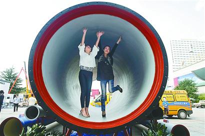 19日,一根兩米多粗的供水管來濟南參加展出,兩名身高1.7米的女孩在里面走秀都綽綽有余。記者張勇 攝