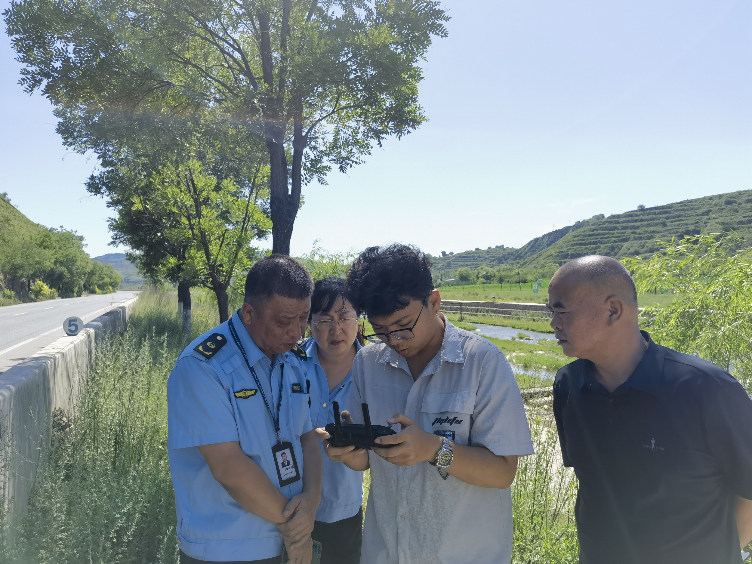 圖為太原市環(huán)保執(zhí)法人員正在用無人機(jī)在汾河婁煩段進(jìn)行全方位摸排