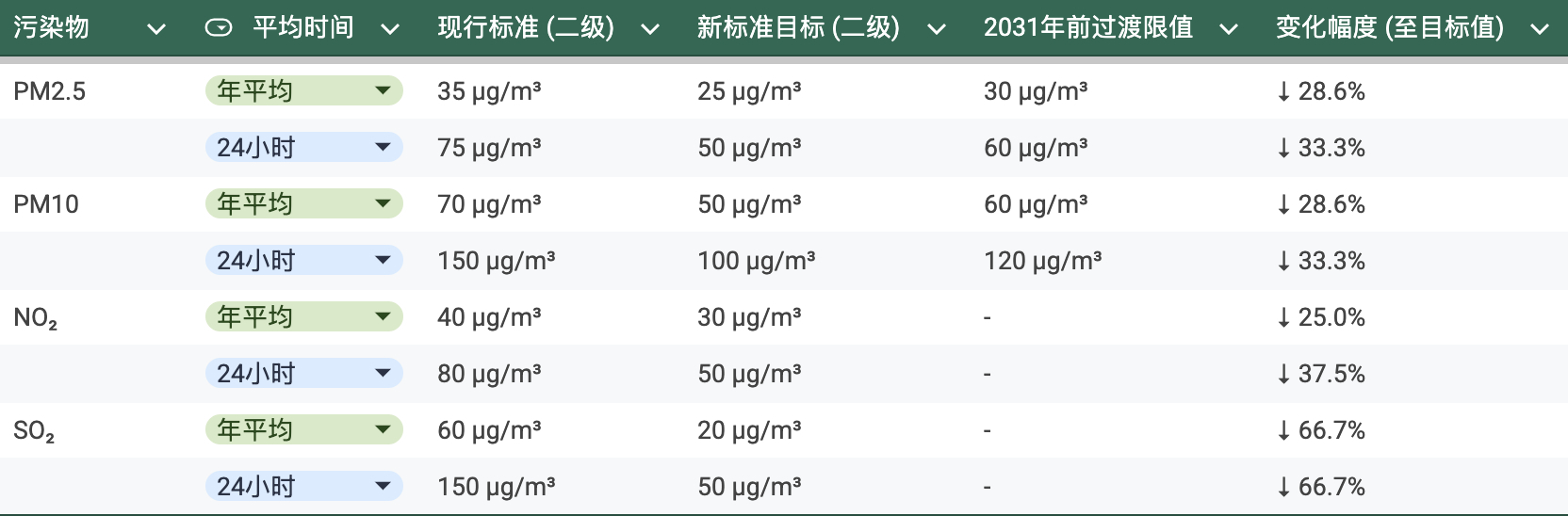 第二階段自2031年1月1日起,全面執(zhí)行新限值。屆時(shí),PM2.5年均二級(jí)限值將正式執(zhí)行25微克/立方米,SO2、NO2等其他污染物的收嚴(yán)限值也將同步實(shí)施。