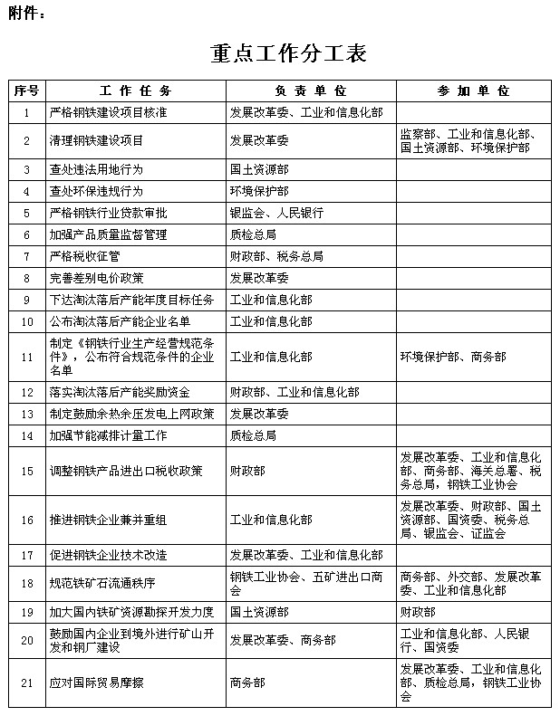 (十六)加強(qiáng)組織協(xié)調(diào),狠抓各項(xiàng)工作落實(shí)。鋼鐵工業(yè)節(jié)能減排和結(jié)構(gòu)調(diào)整是一項(xiàng)重要而艱巨的任務(wù),要狠抓各項(xiàng)政策措施的落實(shí)。各有關(guān)部門(mén)要加強(qiáng)溝通配合,切實(shí)做好鋼鐵工業(yè)節(jié)能減排、結(jié)構(gòu)調(diào)整工作的統(tǒng)籌規(guī)劃和政策協(xié)調(diào),抓緊細(xì)化和落實(shí)有關(guān)政策措施。各地區(qū)要切實(shí)加強(qiáng)組織領(lǐng)導(dǎo),結(jié)合當(dāng)?shù)貙?shí)際制定具體實(shí)施方案和配套辦法并抓好落實(shí)。行業(yè)協(xié)會(huì)、商會(huì)要充分發(fā)揮橋梁和紐帶作用,積極反映鋼鐵行業(yè)的新情況新問(wèn)題,及時(shí)提出政策建議,督促鋼鐵企業(yè)認(rèn)真落實(shí)國(guó)家鋼鐵產(chǎn)業(yè)政策。鋼鐵企業(yè)要從產(chǎn)業(yè)發(fā)展的大局出發(fā),強(qiáng)化內(nèi)部管理,積極開(kāi)展淘汰落后、節(jié)能減排、技術(shù)改造、兼并重組等各項(xiàng)工作。工業(yè)和信息化部要會(huì)同有關(guān)部門(mén)加強(qiáng)監(jiān)督指導(dǎo),確保加大節(jié)能減排力度加快鋼鐵工業(yè)結(jié)構(gòu)調(diào)整各項(xiàng)工作措施落到實(shí)處。