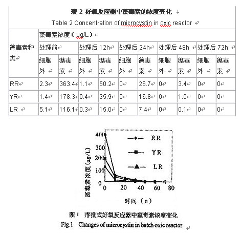 值得注意的是:原水的細(xì)胞外藻毒素非常低,只占總藻毒素濃度的0.6%~4.4%,也即是說(shuō)明處于旺盛生長(zhǎng)期的藻毒素基本上在藻細(xì)胞內(nèi)部。試驗(yàn)結(jié)果表明:此時(shí)藻毒素易被好氧氧化。從表2還可以看到盡管藻毒素總濃度較高,但在好氧生物反應(yīng)條件下,細(xì)胞內(nèi)外的藻毒素均能得到有效的降解。