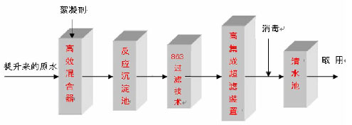 此工藝由高效混合器、反應(yīng)沉淀池、 863過濾技術(shù)和高集成超濾裝置組成。各組成工藝特點(diǎn)如下: