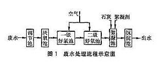 根據(jù)試驗(yàn)結(jié)果及分析,采用厭氧→兩級(jí)好氧→絮凝組合工藝可以有效地處理難降解的含季銨鹽廢水,使廢水中COD總?cè)コ蔬_(dá)96%以上,出水COD<100 mg/L。含季銨鹽廢水處理工藝如圖1。