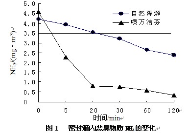通過密封箱內NH3去除試驗,噴霧萬潔芬后,去除NH3的效果明顯強于未使用萬潔芬即自然降解的效果,并且在噴藥后20 min內,效果最顯著,NH3濃度會很快降低。