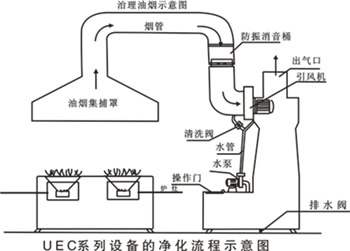 現(xiàn)有餐飲業(yè)發(fā)展迅速 ,油煙塵廢氣排放污染了整個(gè)大氣,嚴(yán)重影響了市民的日常生活與健康。由于各餐飲業(yè)經(jīng)營(yíng)地址不同、安置廚房設(shè)施不同、規(guī)模不同,排放量也不同,統(tǒng)一分別于2眼爐灶至10眼爐灶規(guī)格,以實(shí)際情況設(shè)計(jì)風(fēng)流量及型號(hào)規(guī)格的大小,確保達(dá)到徹底治理的效果。本UEC產(chǎn)品的凈化原理是,先將廢氣(由抽煙罩匯集,經(jīng)引風(fēng)機(jī)吸送)與水有效地混合,通過螺旋增壓相互磨擦、相互碰撞,加重油煙與煙塵的重量,將所有的污染物混合在水中,再通過比重分離、凈化過純空氣上升達(dá)標(biāo)排放。各種污染物沉流在水箱中,由于油的比重比水輕、廢油浮在水質(zhì)上方可以回收,水質(zhì)方可再循環(huán)使用。凈化效率持久,節(jié)省水資源等優(yōu)點(diǎn)。