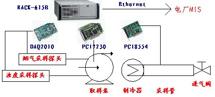 系統(tǒng)的實際工作過程為:PCI-7230啟動抽樣氣閥,讓部分真實煙氣流經(jīng)取樣管,并經(jīng)PCI-8554采集其流量脈沖數(shù)以便計算其流量,經(jīng)必要的降溫且恒溫處理后,采用近紅外線后方散射光方式對其濁度進行檢測。待樣氣進入檢測系統(tǒng)后,進行快速冷凝以減少待測成份的損失。首先由氣液分離器使液態(tài)的氣融膠體、水分等從樣氣中分離出去,然后氣體進入冷凝器中,進一步降溫至10 ℃,使樣氣和水分徹底分離,再經(jīng)過一級細過濾徹底清除微塵的影響,得到比較純的樣氣,進入測試管,由抽樣泵將恒溫、恒壓的煙氣抽入煙氣采樣探頭管便于對其煙氣中的SO2、CO、NO、NO2進行采樣、分析,同時工業(yè)控制計算機通過DAQ-2010采集卡將其采用的樣本值經(jīng)過一定的處理后并加以存儲,通過標準DAQBench功能面板調用以及強大的圖形界面的分析功能對其進行圖形化的結果顯示,并將分析結果通過Ethernet傳送到火電廠的MIS管理系統(tǒng)中去,現(xiàn)地也有數(shù)據(jù)庫,備記載必要的測試結果。