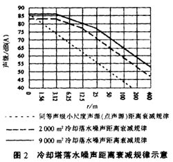 冷卻塔噪聲聲級的絕對值在工業(yè)噪聲中雖然并不算很大,而且其聲能同樣隨著距離每增加一倍而衰減 6 db(“點(diǎn)聲源”),但由于其聲源龐大,它的衰減起始距離較遠(yuǎn)(25m),翻三番便已到了 200 m,相對于25m處也才降了 18 db,所以其影響范圍遠(yuǎn)大于一般性工業(yè)噪聲。仍以 2 000-9 000 m2 的冷卻塔為例,在25 m處(“點(diǎn)聲源” 以外測點(diǎn)、以進(jìn)風(fēng)口底緣為起點(diǎn))實(shí)測所得聲級分別為71.7及77.ldb(a),如按“點(diǎn)聲源”的距離衰減規(guī)律即距離每增加一倍聲能衰減 6 db計(jì),則 50 m處的聲級應(yīng)分別為 65.7及 71.ldb(a);100 m處的聲級應(yīng)分別為 59.7及 65.ldb(a);200 m處的聲級應(yīng)分別為53.7 及 59.ldb(a),220 m處的聲級用公式推算則應(yīng)分別為52.9及58.3 db(a)。這就是噪聲影響范圍(力度)的大致評估,它包含了目前常見的各類大小塔型范圍。借助此法,我們便可根據(jù) 10-25 m處(各塔與其塔型大小相應(yīng)的“點(diǎn)聲源”起始位置)以遠(yuǎn)測點(diǎn)實(shí)測所得聲級,評估各種塔型(單塔)的噪聲影響范圍(力度)。但這只是一種理想條件下的簡便、粗略的評估方法,在實(shí)際廠況環(huán)境中,由于受池水水位變化、淋水密度變化、地表地形、障礙物分布、塔群分布、風(fēng)向風(fēng)力、氣候氣溫及其它聲源的影響,各類冷卻塔噪聲的實(shí)際分布、衰減規(guī)律將會有所出人。據(jù)對吳徑電廠 9 000 m2 冷卻塔的落水噪聲進(jìn)行的實(shí)測[4],在距塔 220 m外的受聲點(diǎn)所測得的噪聲值為55.4-58.3 db(a)(另一次測試結(jié)果為61.9 db(a),估計(jì)受順風(fēng)影響),與我們以 25 m處實(shí)測聲級為依據(jù)推算 220 m 處為 58.3 db(a)的結(jié)果十分吻合。圖2表示冷卻塔噪聲的影響范圍。從圖2中可以看出,由于冷卻塔聲源龐大,在距進(jìn)風(fēng)口 10-25 m范圍內(nèi),噪聲級衰減很慢,其中“面聲源”距離范圍內(nèi)聲級衰減的理論值為零。但對于尺度很小(1m 左右)的一般性聲源,由于不存在“面聲源”及“線聲源”的衰減形態(tài),所以聲源的聲級一開始就按“點(diǎn)聲源”的衰減速率迅速下降,如圖2左側(cè)第一條粗虛線所示。