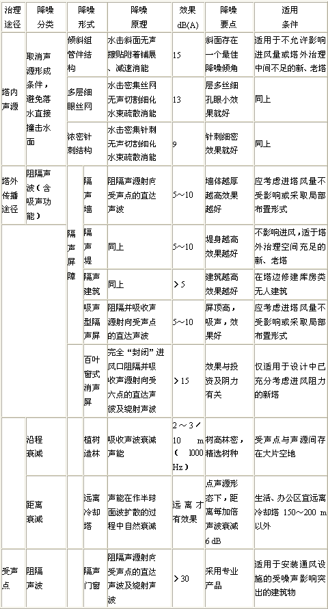 針對噪聲的發(fā)生機(jī)理、傳播方式,可以把冷卻塔噪聲的治理歸結(jié)為塔內(nèi)、塔外兩條基本途徑,塔內(nèi)以聲源的降噪治理為主;塔外則包含有傳聲途徑上的聲波阻隔(隔聲)、聲波吸收(合沿程吸收衰減)以及距離衰減(聲能擴(kuò)散)等三種方式。其中以聲波阻隔輔以聲波吸收為塔外治理的主要手段,無論是塔內(nèi)的聲源治理技術(shù)還是國外已有應(yīng)用的塔外聲波阻隔技術(shù),在我國的應(yīng)用還剛起步,因而都缺乏實(shí)踐應(yīng)用經(jīng)驗(yàn)。下面列表歸納并推薦幾種冷卻塔噪聲的治理技術(shù)供工程參考選用,各自的特點(diǎn)、適用性參見下表。