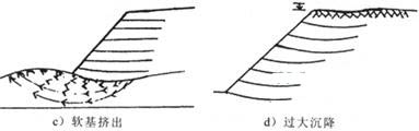 就表現(xiàn)形式而言,在上覆荷載作用下,軟土地基和加筋土體的相互作用可能產(chǎn)生以下破壞形式:①局部滑移,指圍堤沿著加筋坡面產(chǎn)生局部滑動(dòng),圖1-a;②整體滑動(dòng),指圍堤沿著軟基底部發(fā)生整體失穩(wěn),圖1-b;③軟基擠出,因軟土地基局部承載力不足,導(dǎo)致圍堤坡腳處的軟土側(cè)向擠出破壞,圖1-c;④過大沉降,指在荷載短期和長期作用下產(chǎn)生的沉降及不均勻沉降,圖1-d。