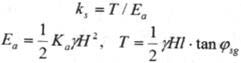 如圖1-a所示,假定堤坡產(chǎn)生局部滑移時(shí),土體側(cè)向滑移力全部由土工格柵承擔(dān),忽略土體本身的抗滑作用。此時(shí),滑動(dòng)力為土體主動(dòng)土壓力Ea,抗滑力等于筋材張力T,兩者在滑動(dòng)面上平衡,得抗滑安全系數(shù)為