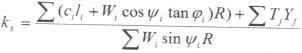 當(dāng)滑動(dòng)面貫穿基土和堤身時(shí),可采用修正的圓弧滑動(dòng)條分法進(jìn)行計(jì)算分析。先試算沒有加筋材料時(shí)的最危險(xiǎn)滑弧,并假定加筋后滑弧的位置不變,且假設(shè)筋材產(chǎn)生的拉力沿水平方向,筋材拉力作用相當(dāng)于增加了抗滑力矩,據(jù)此,可計(jì)算最危險(xiǎn)狀態(tài)下的抗滑穩(wěn)定安全系數(shù)。