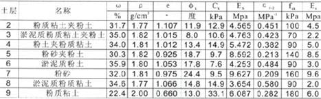 根據(jù)場(chǎng)地勘察報(bào)告,擬建場(chǎng)地30m深度范圍內(nèi)地層由素填土、淤泥質(zhì)粘土、粉質(zhì)粘土、砂質(zhì)粉土、粉砂等交錯(cuò)組成,除淤泥質(zhì)粘土等軟土層外,其余各層地基承載力均在100kPa以上。但②層淤泥質(zhì)粉質(zhì)粘土、④-1淤泥質(zhì)粉質(zhì)粘土夾粉砂、④-3淤泥質(zhì)粉質(zhì)粘土夾粉砂、⑥層淤泥質(zhì)粉質(zhì)粘土、⑧層淤泥質(zhì)粉質(zhì)粘土等軟弱夾層,各層厚度不一,其承載力均在80kPa以下。擬建場(chǎng)地范圍內(nèi)分布土層主要物理力學(xué)指標(biāo)如下所示。