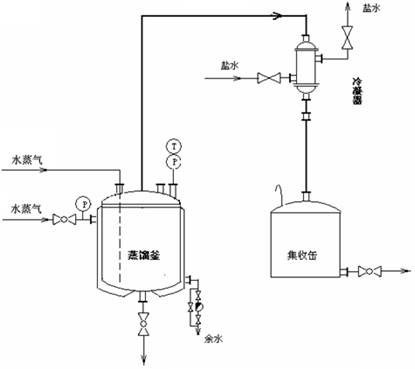 從分析知道,提煉渣中含20%的有機(jī)溶劑,實(shí)驗(yàn)室回收情況:在500 mL帶攪拌的四口瓶中,投入200 g新制的提煉渣,加熱條件下,向瓶中通水蒸氣,蒸餾至冷卻液出液清澈透明為此,將收集到的冷凝液靜置分層,得有機(jī)溶劑40.5 g,質(zhì)量分?jǐn)?shù)98.2%,釜?dú)堃航?jīng)核磁分析,無(wú)有機(jī)溶劑;重復(fù)實(shí)驗(yàn)結(jié)果穩(wěn)定。說(shuō)明通過(guò)簡(jiǎn)單的水蒸氣蒸餾即可完全回收提煉渣的有機(jī)溶劑。通過(guò)設(shè)計(jì)簡(jiǎn)單蒸餾釜、冷卻器及接收罐,投資約10萬(wàn)。企業(yè)對(duì)提煉渣中的有機(jī)溶劑進(jìn)行了回收,回收到的有機(jī)溶劑純度大于98%,完全達(dá)到使用要求,直接套用生產(chǎn)中。設(shè)計(jì)的裝置流程如圖3所示。
