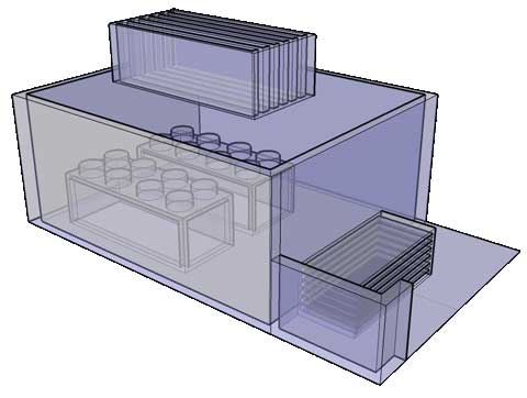 兩臺(tái)熱泵機(jī)組共使用了16個(gè)軸流風(fēng)機(jī),單個(gè)風(fēng)機(jī)的通風(fēng)量為3000m3/小時(shí)。因此噪控設(shè)備必須保證必須保證不低于48000m3/小時(shí)的出風(fēng)量以及與之相對(duì)應(yīng)的進(jìn)風(fēng)量;