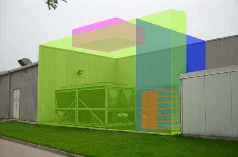 該噪聲治理項(xiàng)目位于新輝電子廠區(qū)內(nèi),噪聲源為兩臺(tái)約克風(fēng)冷熱泵機(jī)組。熱泵機(jī)組西側(cè)1.5米左右、北側(cè)1.5米左右為新輝開電子鋼結(jié)構(gòu)廠房墻體,東側(cè)8米左右為2米高小房,南側(cè)15米左右為工廠圍墻,圍墻外是其他單位的辦公樓。