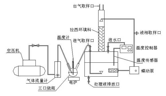 溫控裝置的設(shè)計功能:設(shè)計溫度控制器的目的是控制洗滌液的溫度。由于模擬餐飲油煙的溫度較高,一般在160℃左右,煙氣的洗滌過程也是一個能量傳遞的過程,隨著油煙不斷被洗滌,洗滌液的溫度也將升高,因此,根據(jù)試驗確定微生物降解反應(yīng)的活性溫度范圍,設(shè)置為溫控器的上下限值(25℃~40℃),當(dāng)洗滌液溫度超過上限值時,溫控器自動開啟進(jìn)水閥往洗滌槽進(jìn)水降溫,直到洗滌液溫度低于下限值時又自動關(guān)閉進(jìn)水閥停止進(jìn)水。同時,為了控制洗滌槽的液位,可以安裝液位報警器和自動排液裝置。