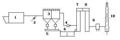 1鍋爐 2冷風(fēng)閥 3低壓脈沖袋式除塵器 4風(fēng)機(jī) 5水力沖灰器 6加藥、曝氣水池 7脫硫主塔 8脫硫副塔 9煙氣加熱器 10煙囪