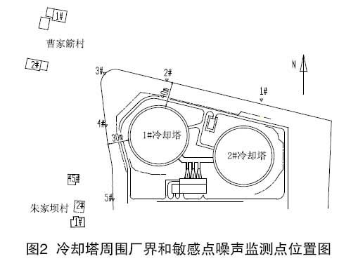 杭州華電半山發(fā)電有限公司的2臺(tái)雙曲線(xiàn)自然通風(fēng)冷卻塔,高度均為80m,淋水面積為5500m2,進(jìn)風(fēng)口高度為7m。1#冷卻塔距西廠(chǎng)界30m,距附近居民住宅約80m,1#、2#冷卻塔距北廠(chǎng)界40m。