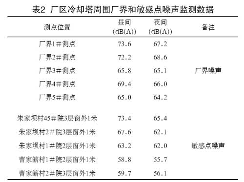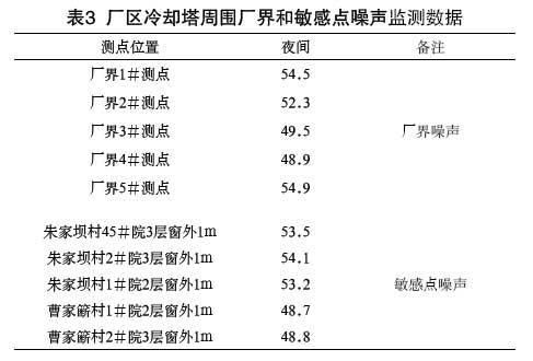 華電半山發(fā)電有限公司廠(chǎng)區(qū)噪聲綜合治理完畢后,浙江省環(huán)境監(jiān)測(cè)中心站對(duì)此進(jìn)行了現(xiàn)場(chǎng)測(cè)試,通過(guò)了環(huán)保驗(yàn)收。施工單位在冷卻塔周?chē)鷱S(chǎng)界和居民住宅處(敏感點(diǎn))的測(cè)試結(jié)果見(jiàn)表3。