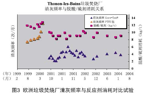 該公司1999年使用普通濾袋后,系統(tǒng)清灰頻率持續(xù)攀升(圖中淺色三角表示)。2000年3月?lián)Q用GORE?濾袋,系統(tǒng)的清灰頻率大幅度下降(圖中深色三角表示)。圖中方塊標(biāo)記記錄了該廠使用不同濾袋的脫酸/硫劑消耗量。該廠脫酸/硫劑月耗量有所波動(dòng),但在使用GOREGore®布袋前后系統(tǒng)的清灰頻率有明顯變化(圖中淺三角變?yōu)樯钊牵6鴮?shí)際的脫酸/硫劑月耗量由原先的約12公斤/噸垃圾下降為約平均9.5公斤/噸垃圾。可見(jiàn),使用薄膜袋濾技術(shù)(Gore®)后,脫酸/硫劑得到了有效的節(jié)約。