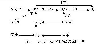 SNCR的反應機理非常復雜,目前仍未能完全了解,多數學者認為NHx基還原劑按圖1 所示的途徑反應: