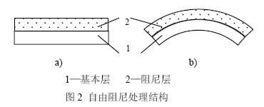自由阻尼處理是將一層一定厚度的粘彈阻尼材料粘貼于金屬基體表面上。當(dāng)結(jié)構(gòu)產(chǎn)生彎曲振動時,阻尼層隨基本結(jié)構(gòu)一起振動,在阻尼層內(nèi)部產(chǎn)生拉-壓變形,如圖 2b所示。根據(jù)阻尼材料的耗能機理,當(dāng)阻尼材料內(nèi)部產(chǎn)生交變應(yīng)力時,阻尼材料就會將有序的機械能轉(zhuǎn)化為無序的熱能,從而起到耗能的作用。自由阻尼結(jié)構(gòu)如圖 2所示。