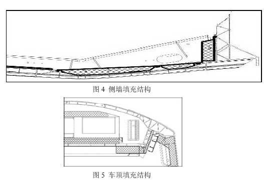 在側(cè)墻金屬基體和客室內(nèi)墻板之間以及車頂和風(fēng)道之間填充玻璃棉或吸聲海綿等微孔吸聲材料,衰減車輛內(nèi)部的混響噪聲,降低車輛內(nèi)部總噪聲級。側(cè)墻填充結(jié)構(gòu)如圖4所示,車頂填充結(jié)構(gòu)如圖5所示。