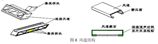 空調(diào)系統(tǒng)在調(diào)節(jié)客室內(nèi)溫度、給乘客創(chuàng)造舒適的環(huán)境的同時,氣體的流動也產(chǎn)生了噪聲?照{(diào)系統(tǒng)可采用下面兩種方法進行降噪:第一,在空調(diào)機組的出風(fēng)口處增加消音裝置;第二、在風(fēng)道的內(nèi)部貼吸音材料。風(fēng)道結(jié)構(gòu)如圖6所示。