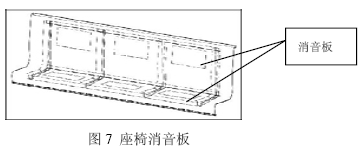 另外,由于車輛連接處是噪聲的主要來源,因此必須在貫通道上采取有效的隔音措施,例如采用雙層棚布及在貫通道和車鉤支承面之間增加耐磨材料等方法有效地降低噪聲。為了有效地控制噪聲在車輛內(nèi)部傳遞,通常在座椅背面貼附消音板(座椅消音板如圖7所示),增強座椅等內(nèi)飾物的吸聲效果,降低車輛內(nèi)部總噪聲級。