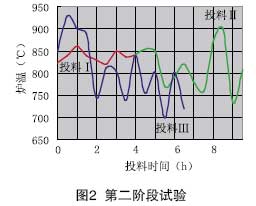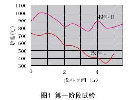投料Ⅰ試驗開始時爐內溫度為750℃,焚燒工況一般,投料1小時后因大量污泥進入燃燒段,爐膛溫度明顯下降,隨著爐膛溫度的下降焚燒過程逐步惡化。2小時內污泥投入完畢,4小時后污泥全部排出爐外,此時爐溫已降至400℃以下。投料Ⅱ試驗開始時爐內焚燒溫度約為900℃,垃圾干燥,焚燒工況良好。整個試驗過程雖然溫度有所下降,但可正常焚燒。