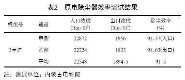 內(nèi)蒙古豐鎮(zhèn)發(fā)電廠#3號(hào)機(jī)組原高壓靜電除塵器的通流截面積為170×2m2(原電除塵器主要設(shè)計(jì)參數(shù)見表1)。從投產(chǎn)到2004年上半年,電除塵器運(yùn)行一直比較穩(wěn)定,效率一直為98%~99%,這一時(shí)期內(nèi)鍋爐燃燒用煤以大同小煤窯為主。自2004年下半年開始,鍋爐燃燒用煤以準(zhǔn)格爾煤為主。由于準(zhǔn)格爾煤灰分比較高,為22%~30%,致使該廠高壓電除塵器的工作負(fù)荷增大,測試結(jié)果(見表2)表明,電除塵器入口的粉塵濃度遠(yuǎn)遠(yuǎn)超出入口粉塵濃度的設(shè)計(jì)值,致使電除塵器粉塵量增大,工作環(huán)境惡劣,電除塵器的運(yùn)行出現(xiàn)了極不穩(wěn)定的現(xiàn)象,除塵效率降低,除塵器出口的煙塵排放濃度超出國家排放標(biāo)準(zhǔn),鍋爐風(fēng)機(jī)的正常運(yùn)行也受到了影響。