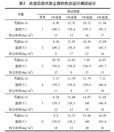 除塵器正常運(yùn)轉(zhuǎn)后,對(duì)包括粉塵濃度在內(nèi)的各方面技術(shù)參數(shù)進(jìn)行了測試(詳見表3)。