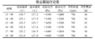 2005年6月18日整機投入試運轉(zhuǎn),下表是7月16日下午收塵器運行情況記錄。