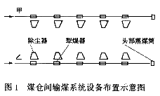 煤倉間地面標(biāo)高35m,布置甲、乙兩條平行皮帶機(jī),機(jī)架長度均為130m,帶速2m/s,帶寬B=l000mm,皮帶槽型底面距地面垂直距離1.0m,兩條皮帶中心線相距3.2m。每條皮帶機(jī)各布置五臺(tái)單側(cè)犁煤器,通過各自卸料斗,向三臺(tái)燃煤鍋爐原煤倉配煤,兩條皮帶機(jī)頭部也設(shè)置落煤筒直接向原煤倉供煤。10只卸料斗旁各布置一臺(tái)立式布袋除塵器(20世紀(jì)80年代產(chǎn)品),皮帶機(jī)頭部和回程空段皮帶上安裝有清掃器,上、下機(jī)架裝有少量調(diào)心托輥組。尾部安裝小車式重錘拉緊裝置。尾部兩只落煤筒剛剛進(jìn)行過除塵器、導(dǎo)料槽改造。煤倉間輸煤系統(tǒng)設(shè)備布置如圖1所示。
