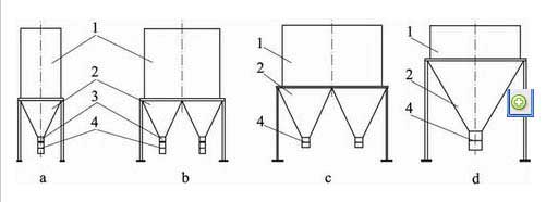 2)要求制造商盡可能改變灰斗形狀,以縮短螺旋輸送機(jī)的長(zhǎng)度。其長(zhǎng)度小于4m時(shí),不用吊軸承結(jié)構(gòu),可便于檢修和維護(hù)。在廠(chǎng)房高度較高、并滿(mǎn)足抽袋空間的前提下,可采用多灰斗結(jié)構(gòu)(如圖1c),取消螺旋輸送機(jī),這樣既可減少設(shè)備維護(hù),也可節(jié)約用電。多樓層布置時(shí),因廠(chǎng)房空間高,可采用圖1d方案,加長(zhǎng)灰斗(適合少于4室的脈沖袋式除塵器)。此方法的灰斗用料稍有增加,但運(yùn)行費(fèi)用的下降在4個(gè)月就可收回增加的投資。