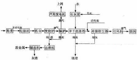 垃圾焚燒發(fā)電廠主要由垃圾接受系統(tǒng)、焚燒系統(tǒng)、余熱鍋爐系統(tǒng)、燃燒空氣系統(tǒng)、汽輪發(fā)電系統(tǒng)、煙氣凈化系統(tǒng)、灰渣、滲瀝水處理系統(tǒng)、蒸汽及冷凝水系統(tǒng)、廢金屬回收、自動(dòng)控制和儀表系統(tǒng)等組成。其工藝流程見(jiàn)圖1。