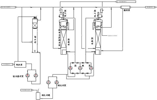 由煤氣鼓風(fēng)機(jī)來的煤氣首先進(jìn)入煤氣預(yù)冷塔底部,被塔中部的由氨水循環(huán)泵提供的冷態(tài)氨水噴淋降溫,然后進(jìn)入煤氣預(yù)冷塔上部,在上部,由氨水循環(huán)泵提供的冷態(tài)氨水進(jìn)行噴淋,煤氣和填料充分接觸后,被冷卻至30-35℃左右,煤氣直接進(jìn)入脫硫塔。