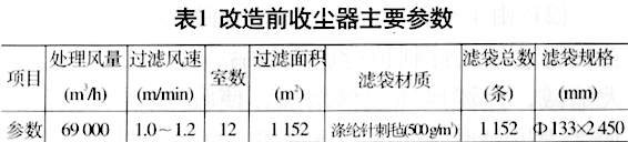 某公司原φ3m×11m水泥粉磨系統(tǒng)采用PPW96-2×6型氣箱脈沖收塵器,改造前參數(shù)見表1。自2002年投入使用以來存在著運(yùn)行阻力大、排放超標(biāo)、過濾風(fēng)速高等問題,嚴(yán)重影響了系統(tǒng)的達(dá)標(biāo)運(yùn)轉(zhuǎn)和公司經(jīng)營,同時(shí),公司欲將該系統(tǒng)改造為聯(lián)合擠壓粉磨系統(tǒng)進(jìn)行提產(chǎn),原除塵器更不能滿足生產(chǎn)的需要,于是我公司自行對(duì)該收塵器進(jìn)行了升級(jí)改造,收到了良好的使用效果,近3年來,幾乎為零故障,保證了生產(chǎn)的正常進(jìn)行。