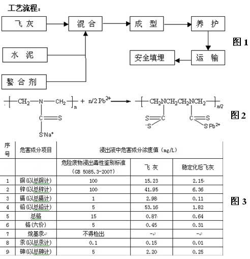 原理:螯合劑是一種能通過兩個或兩個以上官能團(tuán)與金屬離子鍵合,并形成有機(jī)大分子團(tuán)的特殊絡(luò)合劑。重金屬螯合劑(固德GOODR)可以與飛灰中的Hg、Pb、Cd、Zn、Cr、Cu、Ni、Ba、Be、Ag等重金屬離子發(fā)生螯合反應(yīng),生成性質(zhì)穩(wěn)定的不溶性螯合物。以Pb2+為例,其與螯合劑反應(yīng)的方程式可以表示如下。見圖2