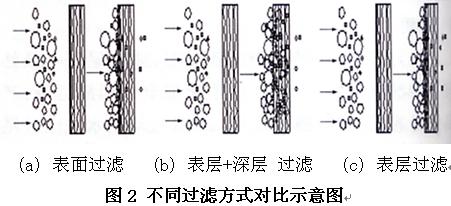 超細面層使針刺氈表面更致密,阻擋微細塵粒能力提高,表面易清灰。不同過濾方式示意圖見圖2。