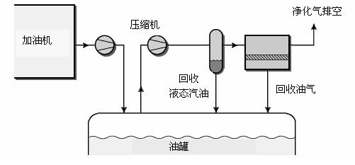 當加油站給機動車加油時,空氣和油氣組成的混和氣被泵抽回油罐,填補油罐中油減少部分的體積;由于空氣的進入,導致油罐頂部的油氣組分的分壓小于飽和蒸汽壓,這樣油罐中的汽油會繼續(xù)揮發(fā)直至油罐上方油氣組分的分壓等于飽和蒸汽壓。當油罐頂部的油氣壓力達到0.025KPa(G)左右時,膜法油氣回收系統(tǒng)會自動啟動,油氣經(jīng)壓縮機壓縮后首先進入一個冷凝器分離冷凝下來的油氣,冷凝的液態(tài)汽油通過管線回到油罐當中,氣體部分從冷凝器頂部留出,進入膜組件;進入膜組件的氣體被分為富含油氣的滲透相及凈化了的空氣(滲余相)。富含油氣的滲透相通過管線回到油罐,凈化空氣則可以直接排空;隨著膜法油氣裝置的運行,油罐上方的壓力會逐漸下降,當油罐頂部的壓力下降到-0.13KPa(G)左右時,系統(tǒng)會自動停止直至油罐頂部的油氣壓力達到 0.025KPa(G) 左右時再次啟動。詳見下圖加油站膜法油氣回收。