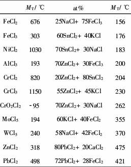 處于焚燒環(huán)境中的金屬材料,其表面上粘附堆積的粉塵中除金屬氧化物外,還含有高濃度的堿金屬、堿土金屬和其他重金屬的氯化物和硫酸鹽。其中PbCL2、 ZnCL2和SnCL2都是低熔點的氯化物,其他的氯化物如NaCl、KCl和FeCl3熔點雖不太低,但可與其他物質(zhì)結(jié)合形成低熔點的共晶混合物,大大增加了高溫部件金屬材料的腐蝕速率[8,9]。表2給出了垃圾焚燒環(huán)境中較為常見的幾種金屬氯化物或其共晶鹽的熔點。作者及所在課題組成員近來研究合金在模擬垃圾焚燒環(huán)境中的腐蝕行為時也發(fā)現(xiàn),即使在350~450℃的溫度范圍內(nèi),當(dāng)合金表面涂有重金屬氯化物混合鹽時,一種鎳基合金表面出現(xiàn)了大量的瘤狀缺陷,而SS310和HP耐熱鋼則發(fā)生了嚴(yán)重的氧化膜剝落現(xiàn)象。這些金屬氯化物鹽的侵蝕被認(rèn)為是造成垃圾焚燒爐金屬材料腐蝕的主要原因。事實上,材料服役過程中的鹽腐蝕往往是一個氧化、氯化、硫化及電化學(xué)腐蝕同時并存的復(fù)雜反應(yīng)過程,受到各種腐蝕介質(zhì)的交互作用影響。