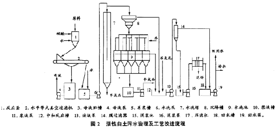 我院在承擔(dān)東北某廠活性白土污水治理設(shè)計(jì)的同時(shí),對(duì)原生產(chǎn)工藝進(jìn)行了改進(jìn),使活性白土產(chǎn)量由原來的2.2×104t/a提高到3×104t/a。