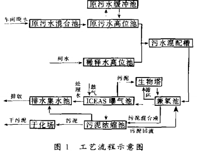 生產(chǎn)車間來的原污水在污水混臺(tái)池中調(diào)節(jié)pH值至9—10后送至原荇水高位池河水用泵提升至稀釋水高位池。原污水和稀釋水分別從高位池流至混臺(tái)槽由下往上混臺(tái)后溢流至兼氧池(池內(nèi)安裝扇形混臺(tái)填料);部分處理廢水經(jīng)循環(huán)泵提升到生物塔由上而下噴淋與生物膜接觸,吸附氧化及臺(tái)成細(xì)胞體,同時(shí)生物塔能氧化活性污泥難以氧化的有機(jī)物,從而得到初步凈化。處理后的廢水成為有氧水回流至兼氧池與無氧廢水混臺(tái),在兼氧池與填料上生物膜接觸后又次吸附氧化,把高分子有機(jī)物分解成低分子有機(jī)物,從而使廢水得到第二次凈化。兼氧池出水流人周期循環(huán)延時(shí)曝氣池(池內(nèi)裝有扇形混臺(tái)填料),廢水與生物膜吸附氧化并合成細(xì)胞體廢水第三次得到凈化(空氣由離心鼓風(fēng)機(jī)供氣);出水經(jīng)潷水器每日潷水二次,l2小時(shí)為一周期,其中靜止沉淀30min,然后潷水同時(shí)取樣.潷水約30~60min,每次潷水量為750m3,排人下水道流人排水集水池,經(jīng)排水泵排出兼氧池及曝氣池的剩余污泥,以靜壓壓人污泥濃縮池,沉淀濃縮后定期排人污泥干化場。