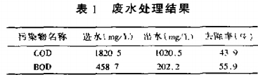 在實(shí)際運(yùn)行中,該段工藝污水平均停留時(shí)聞為9.6h。生物相兼氧池因無氧或低氧,填料上的掛膜數(shù)量較少,并伴有少量的小滴蟲和數(shù)量極少、活動(dòng)能力較弱的線蟲(可能由生物塔沖下);生物塔內(nèi)填料上的生物相對(duì)較為豐富,數(shù)量也較多,而且由上而下,生物種類增多,膜逐漸增厚。主要生物有小滴蟲、線蟲、淘刺斜管蟲、草履蟲等。由于噴淋水流在生物塔上的停留時(shí)間太短,無法單獨(dú)測定生物塔或兼氧池的污染物去除效果,只能合起來測定,日處理1500噸廢水結(jié)果如表1。