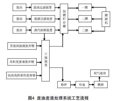 對(duì)于工業(yè)生產(chǎn)中所產(chǎn)生的廢油、廢液、重油等物質(zhì),在前處理系統(tǒng)中,可采用廢油、廢液過(guò)濾和重油蒸汽濃縮裝置進(jìn)行預(yù)處理,而對(duì)含廢油、廢液的工業(yè)廢棄物與高粘度油廢物可采用干燥方式加以處理后再進(jìn)行燃燒。廢油廢液處理系統(tǒng)工藝流程見(jiàn)圖4。
