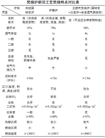 (1)采用傳統(tǒng)的回轉(zhuǎn)窯爐與往復(fù)式爐排爐相結(jié)合的焚燒技術(shù),將回轉(zhuǎn)窯爐的窯爐作為一燃室對(duì)各種垃圾與廢棄物進(jìn)行充分的熱解氣化,回轉(zhuǎn)窯爐的尾端與往復(fù)式爐排爐上下相連,使在回轉(zhuǎn)窯爐(一燃室)里熱解氣化的物料或沒(méi)有燃盡的物料隨著轉(zhuǎn)爐旋轉(zhuǎn)自動(dòng)進(jìn)入往復(fù)式爐排進(jìn)行二次焚化(二燃室),從而徹底解決了因垃圾廢棄物料密度不同而帶來(lái)的燃燒不充分和煙氣停留時(shí)間短等問(wèn)題;在往復(fù)式爐排上方設(shè)置垂直空氣燃燒室(三燃室),讓煙氣進(jìn)行再次燃燒,使煙氣停留時(shí)間大于4s,可從根本上解決垃圾焚燒所產(chǎn)生的煙氣帶來(lái)的二次污染問(wèn)題。焚燒爐新舊工藝的焚燒特點(diǎn)對(duì)比見(jiàn)下表。