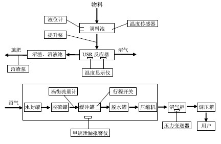 目前,國(guó)內(nèi)大多數(shù)沼氣集中供氣工程都是采用繼電器邏輯控制,這類系統(tǒng)方式單一,自動(dòng)化程度較低,只能處理一些開(kāi)關(guān)量問(wèn)題,無(wú)法處理系統(tǒng)的模擬量,并且電氣線路復(fù)雜,可靠性不高,不便維修。同時(shí)由于一些較重要的數(shù)據(jù)不能適時(shí)記錄和統(tǒng)計(jì),繼而使得沼氣工程的運(yùn)行不能方便快捷,并易造成勞動(dòng)力、原料等資源的浪費(fèi)。另外,由于沼氣站運(yùn)行過(guò)程中的工藝參數(shù)(如:調(diào)料池內(nèi)物料的溫度、USR反應(yīng)器內(nèi)的溫度、沼氣凈化室內(nèi)沼氣的流量等)不能在線顯示,為了比較精確地控制運(yùn)行條件,需要操作人員進(jìn)行現(xiàn)場(chǎng)監(jiān)測(cè),因此,增加了勞動(dòng)強(qiáng)度,并且不便管理。