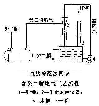 如圖是直接冷凝法回收含癸二腈廢氣工藝流程。尼龍生產(chǎn)中含癸二睛的廢氣自反應(yīng)釜進人貯槽,溫度為300℃,比癸二睛的沸點高約100℃。具有一定壓力的水進人引射式凈化器后,由于喉管處的高速流動,形成負壓,將含癸二睛的高溫廢氣吸人凈化器,并與噴人的水充分混合,形成舞狀,直接進行冷凝與吸收。冷凝后的癸二腈在循環(huán)液貯槽的上方聚集,回收后用于尼龍生產(chǎn),下層水可循環(huán)使用。