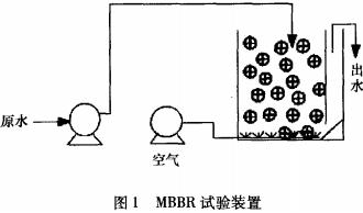 實驗裝置流程如圖1所示,MBBR反應(yīng)器采用有機玻璃加工而成,有效尺寸為16cm×16cm×22cm,有效容積為6L。采用微孔曝氣和連續(xù)進水方式。